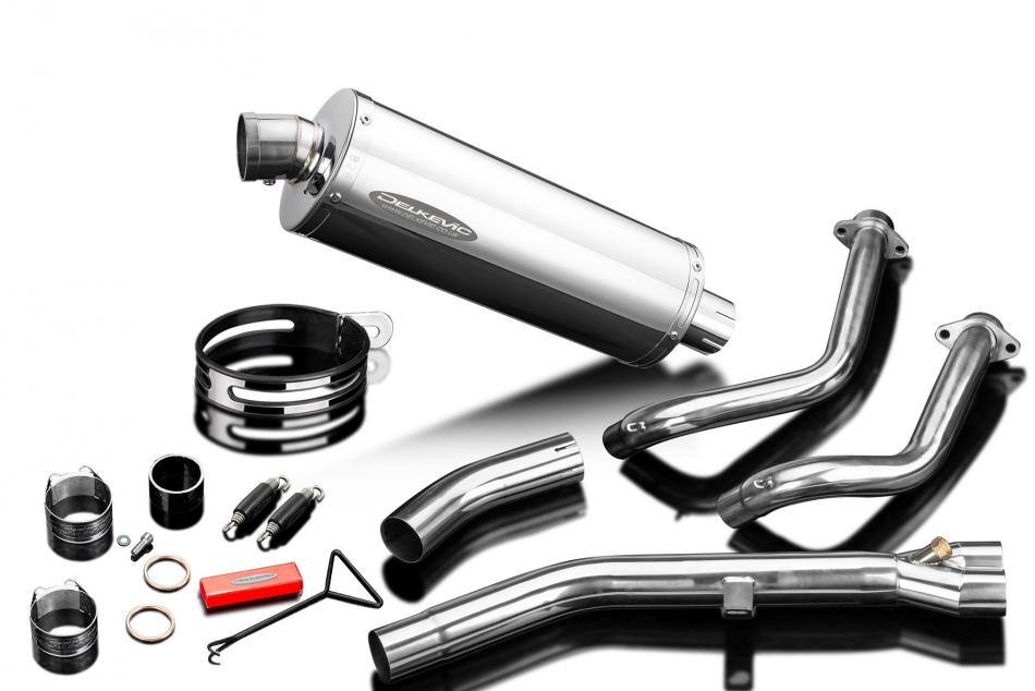 Complete exhaust system for Honda CB750 Hornet with Delkevic 350mm Oval Stainless Steel Silencer. All Delkevic complete systems come with gaskets (where needed) clamps. We manufacture all our exhaust components in our own factory employing the most stringent quality control procedures.