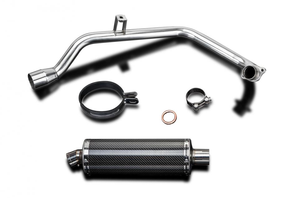 Complete exhaust system for Honda CB125F (2015-2020) with Delkevic 350mm Oval Carbon Fibre Silencer. All Delkevic complete systems come with gaskets (where needed) clamps. We manufacture all our exhaust components in our own factory employing the most stringent quality control procedures.