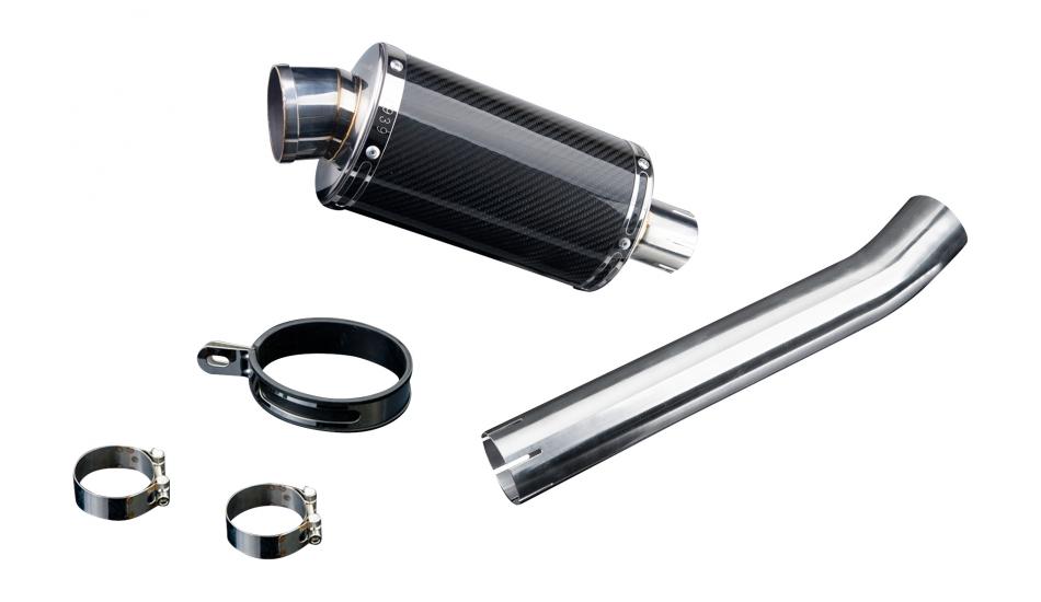 Replacement Silencer Kit for Honda with Delkevic DS70 225mm Oval Carbon Fibre Silencer. Delkevic silencers are handcrafted from the highest quality materials to enhance your motorcycle in both performance and looks. We guarantee to improve your riding experience at an unbeatable price. The vast majority of our silencer kits come with all gaskets needed.
