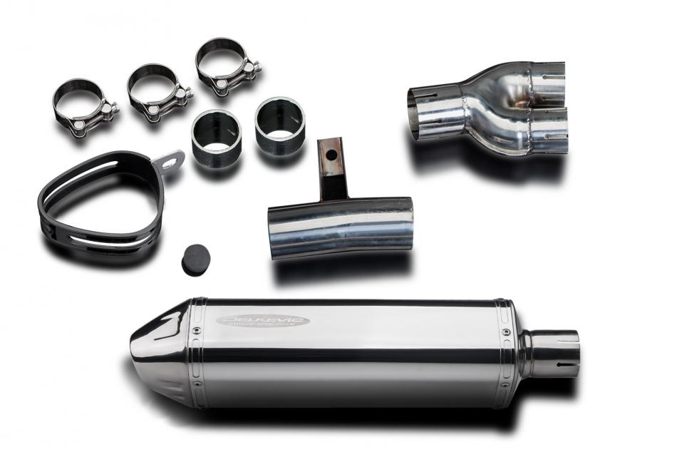 Replacement Silencer Kit for Honda NTV600 (1988-1991) with Delkevic 320mm Tri-Oval Stainless Steel Silencer. Delkevic silencers are handcrafted from the highest quality materials to enhance your motorcycle in both performance and looks. We guarantee to improve your riding experience at an unbeatable price. The vast majority of our silencer kits come with all gaskets needed.