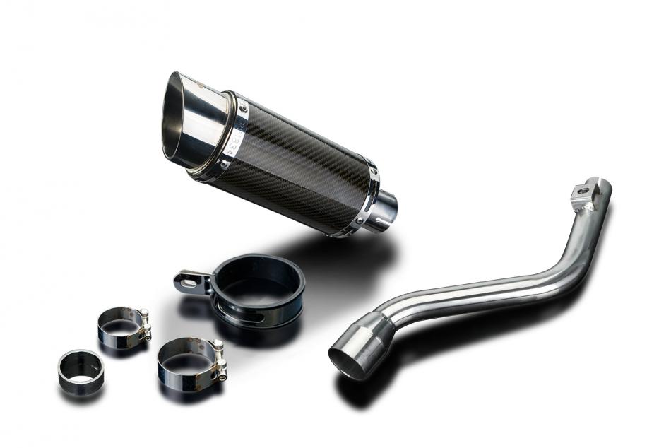 Replacement Silencer Kit for Honda XR125L with Delkevic Mini 200mm Round Carbon Fibre Silencer. Delkevic silencers are handcrafted from the highest quality materials to enhance your motorcycle in both performance and looks. We guarantee to improve your riding experience at an unbeatable price. The vast majority of our silencer kits come with all gaskets needed.