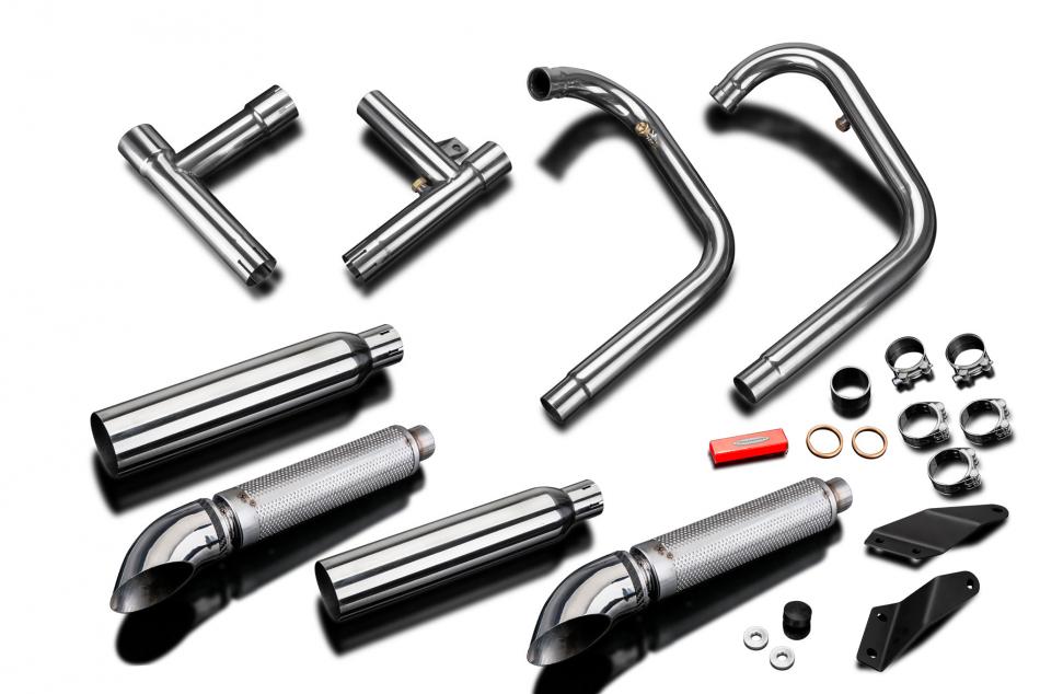 Complete exhaust system for Kawasaki W650 (1999-2006) with Delkevic W650 W800 CUSTOM SILENCER BRACKETS x2. All Delkevic complete systems come with gaskets (where needed) clamps. We manufacture all our exhaust components in our own factory employing the most stringent quality control procedures.