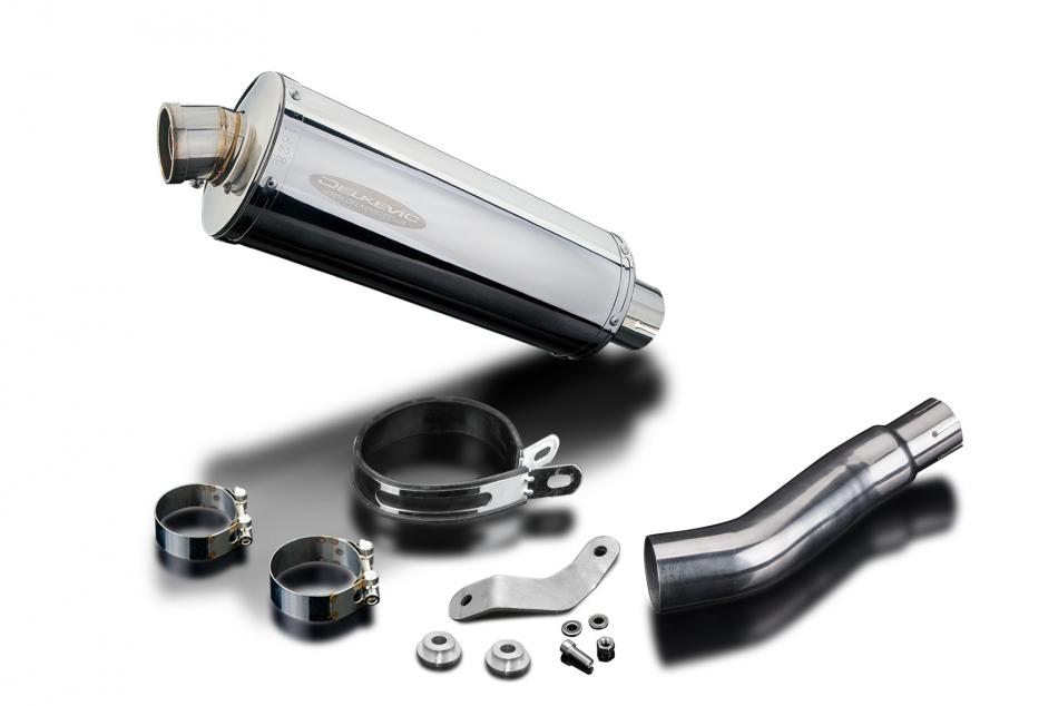 Replacement Silencer Kit for Kawasaki Z300 with Delkevic 350mm Oval Stainless Steel Silencer. Delkevic silencers are handcrafted from the highest quality materials to enhance your motorcycle in both performance and looks. We guarantee to improve your riding experience at an unbeatable price. The vast majority of our silencer kits come with all gaskets needed.
