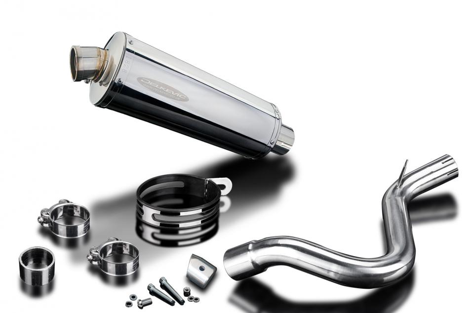 Replacement Silencer Kit for KTM 125 Duke (2011-2015) with Delkevic 350mm Oval Stainless Steel Silencer. Delkevic silencers are handcrafted from the highest quality materials to enhance your motorcycle in both performance and looks. We guarantee to improve your riding experience at an unbeatable price. The vast majority of our silencer kits come with all gaskets needed.